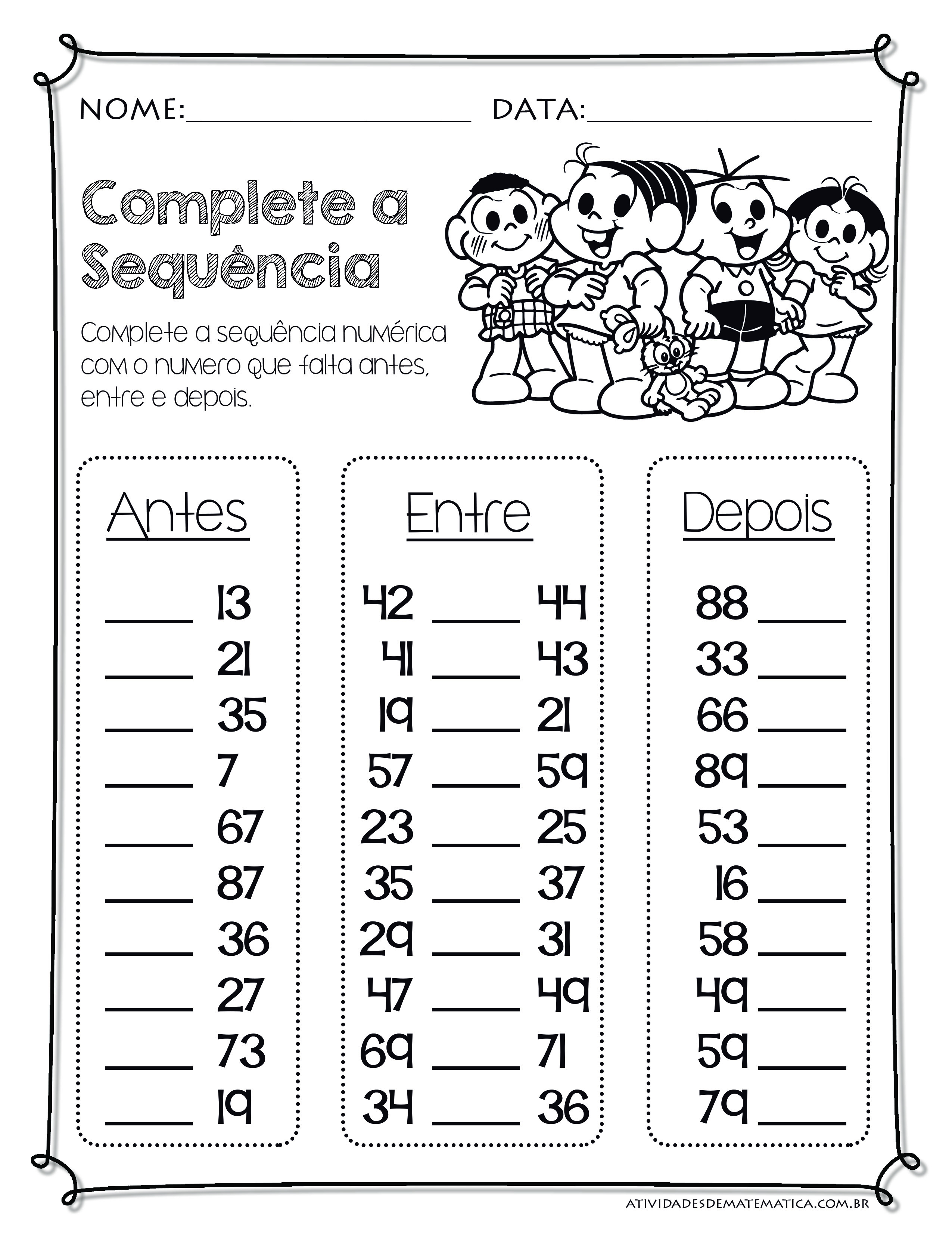 Simples atividade para completar a sequencia de números. Boa dica para ajudar a contar os números corretamente.